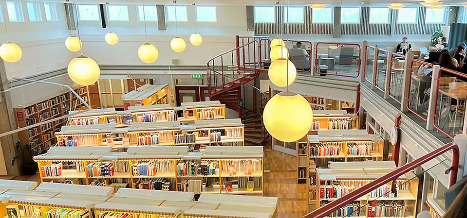 Med 130 sittplatser i olika miljöer finns också goda möjligheter att sitta och studera. Biblioteket har en stor balkong med många bord där för att läsa böcker eller plugga. Det finns små studierum för de som vill sitta avskilt, vilket passar bra vid grupparbete eller liknande.